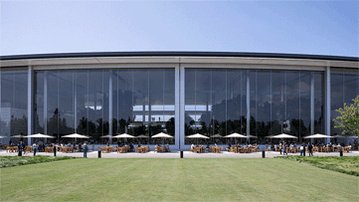 Appleのティム・クックCEOが、Appleの本社「Apple Park」の食堂とみられる場所に設置してある高さ数十メートルと思われるガラスの扉が開く様子をTwitter上で公開している。